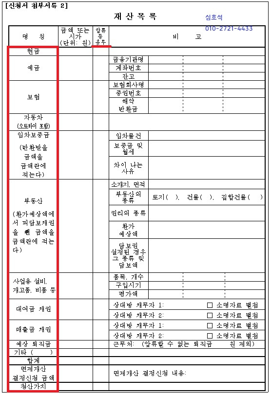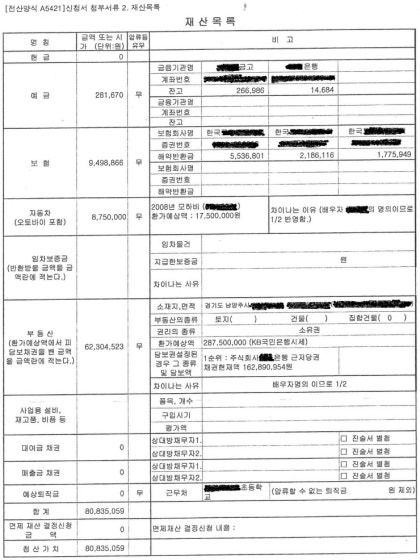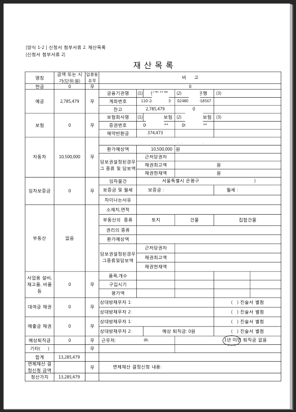 - 현금 및 예금 : 보유하고 있는 현금과 은행 예금의 총액을 기재합니다. 예를 들어, 현금이 100,000원이 넘는 경우에는 반드시 기재해야 합니다.