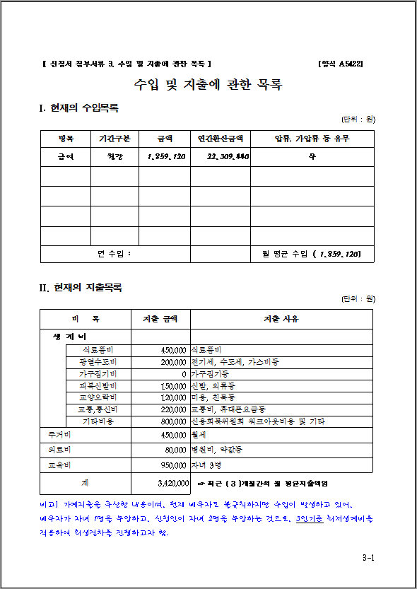 예를 들어, 급여의 경우 직장명, 직위, 월급여액 등을 기재해야 합니다.