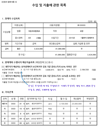 - 최저생계비 : 예상 지출이 보건복지부가 공표한 최저생계비의 150%를 초과하지 않도록 주의해야 합니다.