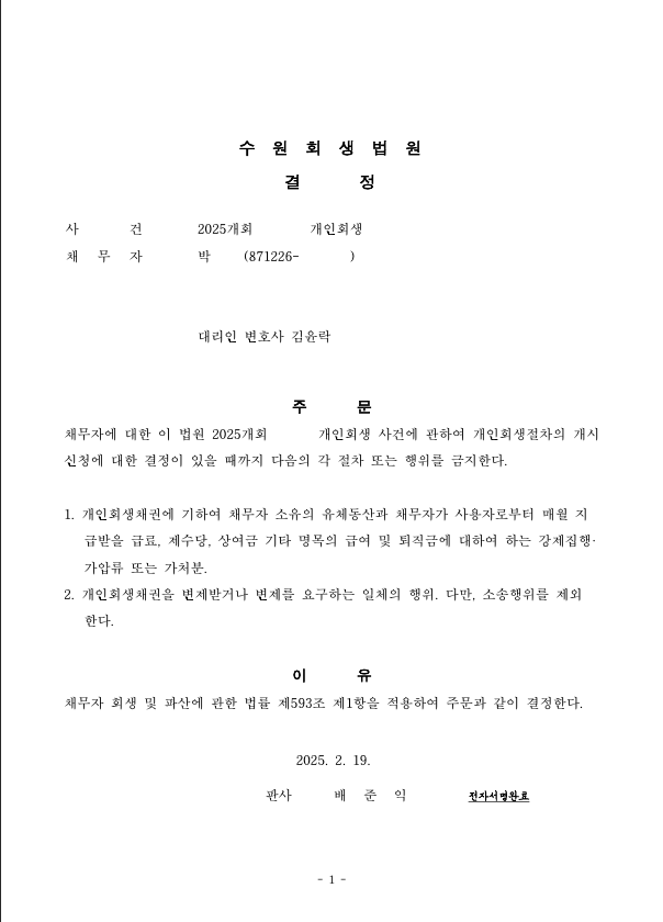 개인회생 금지명령은 법원이 채무자의 재산을 보호하기 위해 특정 행위를 금지하는 명령입니다. 이 명령은 채무자가 개인회생 절차를 신청한 후, 법원이 채무자의 재산이 불법적으로 처분되거나 채권자에 의해 강제집행되는 것을 방지하기 위해 발부됩니다. 금지명령이 내려지면 채무자는 일정 기간 동안 특정 재산에 대한 처분이나 채권자에 의한 강제집행을 막을 수 있습니다.